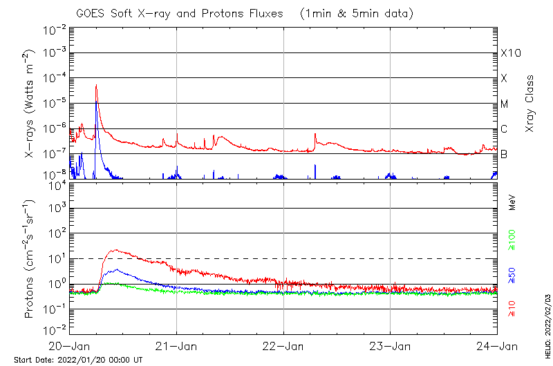 This page provides light-curves generated from GOES soft X-ray and Particle data for the date indicated at the top and the preceding three days.