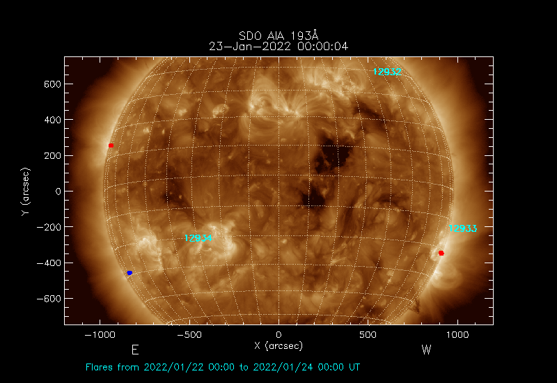 The most recent flares (≤12 hours) are shown as red dots, 12-24 hours ago as blue dots and older ones as turquoise dots.