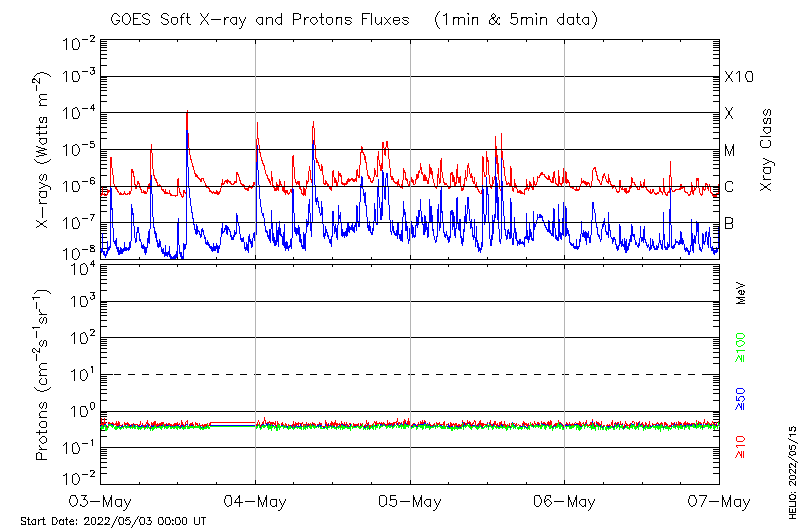 This page provides light-curves generated from GOES soft X-ray and Particle data for the date indicated at the top and the preceding three days.