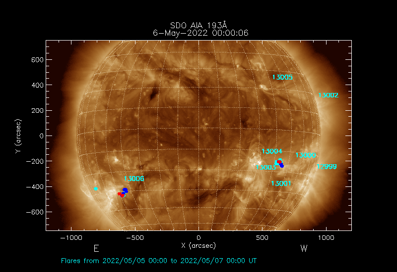 The most recent flares (≤12 hours) are shown as red dots, 12-24 hours ago as blue dots and older ones as turquoise dots.
