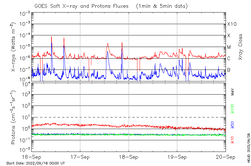 This page provides light-curves generated from GOES soft X-ray and Particle data for the date indicated at the top and the preceding three days.