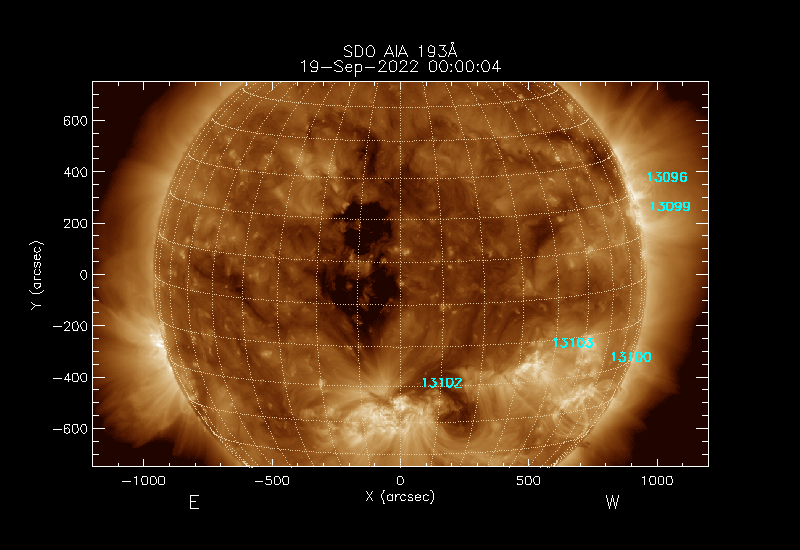 Click on an Active Region plot to display the Region Report including the region evolution and flaring history. HEC Search for NOAA Active Regions (SRS) records for this date and the day before.