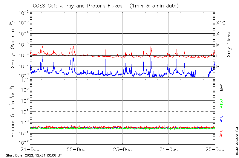 This page provides light-curves generated from GOES soft X-ray and Particle data for the date indicated at the top and the preceding three days.