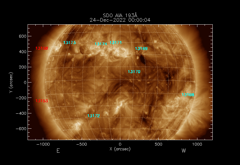 those in red (on the left hand side of the image) indicate where old Active Regions that could be returning.