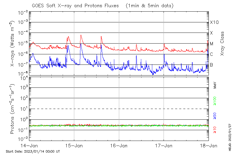 This page provides light-curves generated from GOES soft X-ray and Particle data for the date indicated at the top and the preceding three days.