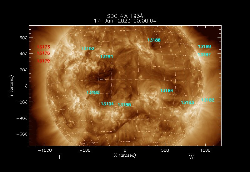 Click on an Active Region plot to display the Region Report including the region evolution and flaring history. HEC Search for NOAA Active Regions (SRS) records for this date and the day before.