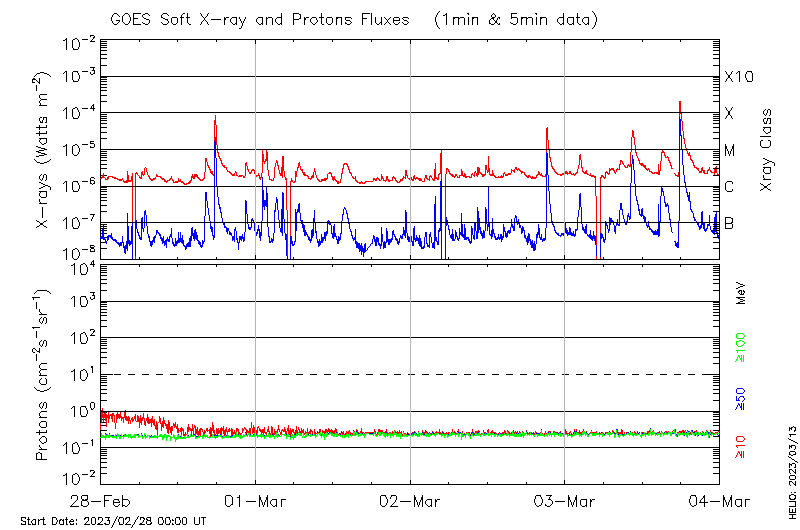This page provides light-curves generated from GOES soft X-ray and Particle data for the date indicated at the top and the preceding three days.