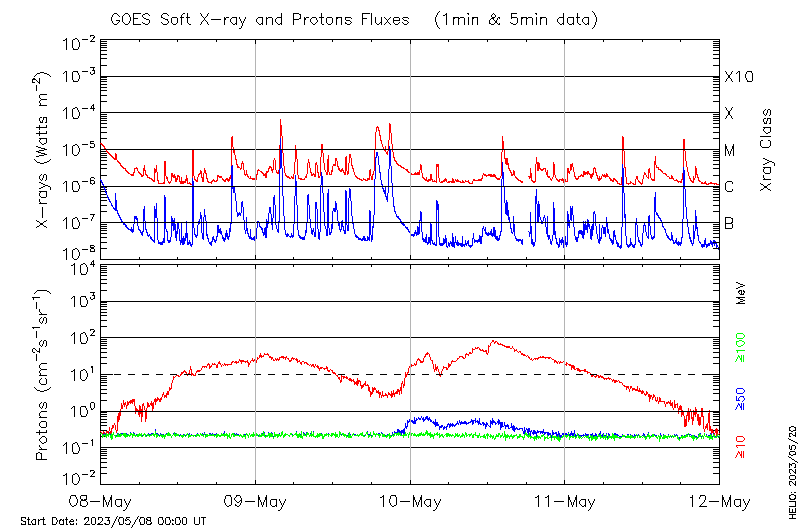 This page provides light-curves generated from GOES soft X-ray and Particle data for the date indicated at the top and the preceding three days.