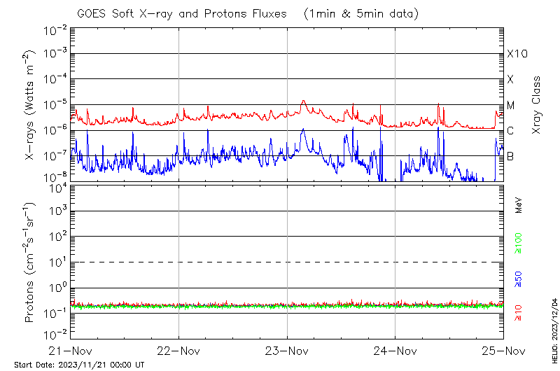 This page provides light-curves generated from GOES soft X-ray and Particle data for the date indicated at the top and the preceding three days.