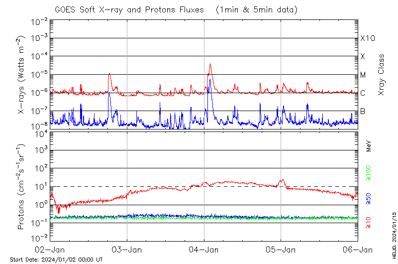 This page provides light-curves generated from GOES soft X-ray and Particle data for the date indicated at the top and the preceding three days.