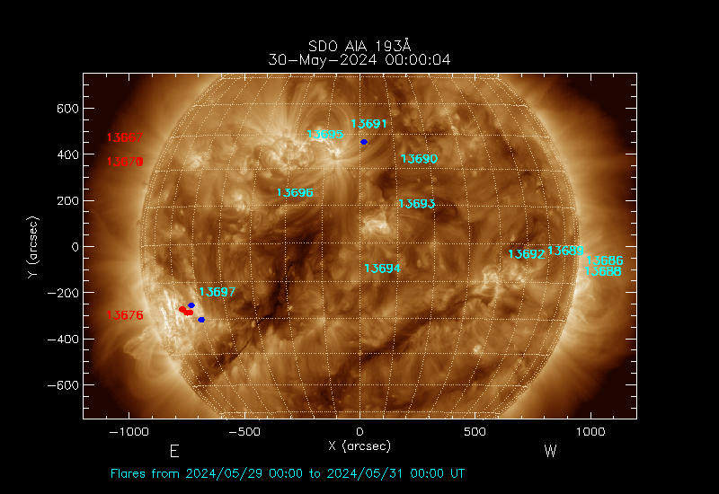 The most recent flares (≤12 hours) are shown as red dots, 12-24 hours as blue