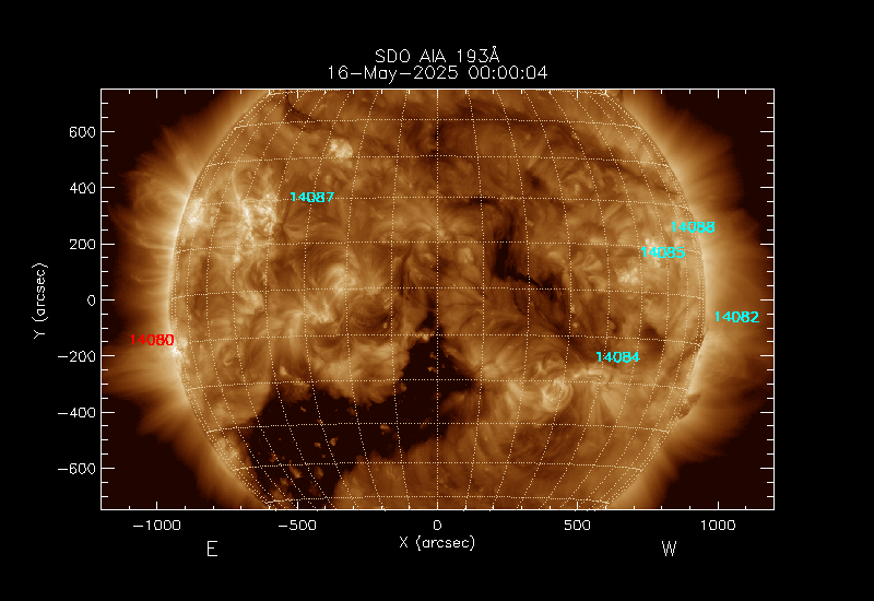 Click on an Active Region plot to display the Region Report including the region evolution and flaring history. HEC Search for NOAA Active Regions (SRS) records for this date and the day before.