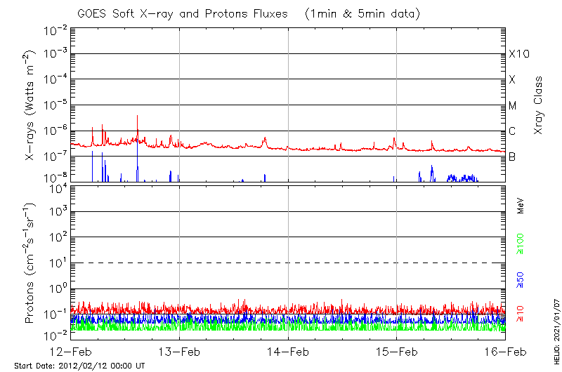 This page provides light-curves generated from GOES soft X-ray and Particle data for the date indicated at the top and the preceding three days.