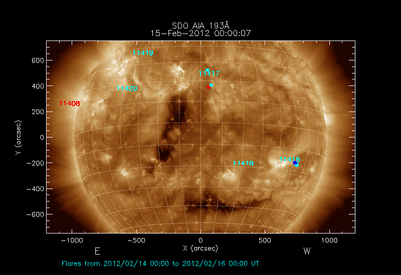 All soft X-ray flares (≥A1.0) where the location has been determined are shown; the flare locations are rotated to the time of the image