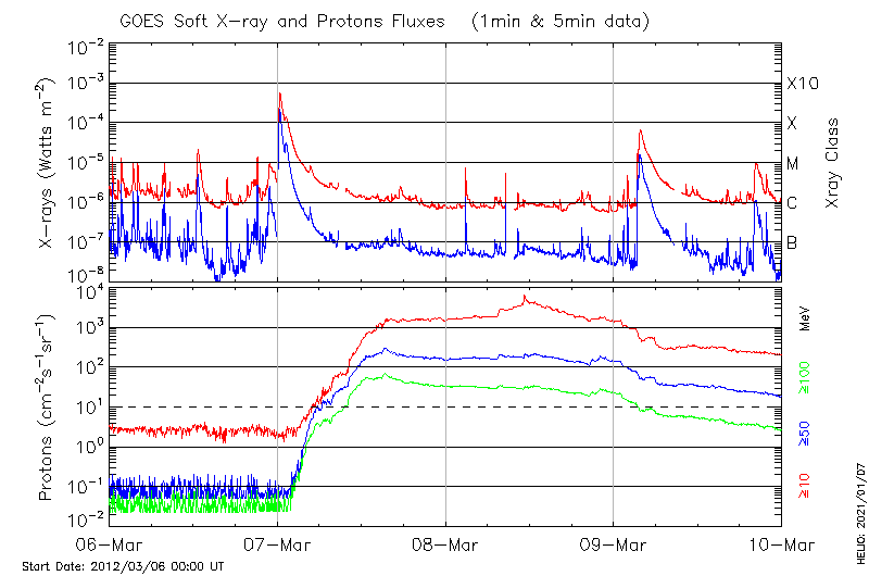This page provides light-curves generated from GOES soft X-ray and Particle data for the date indicated at the top and the preceding three days.