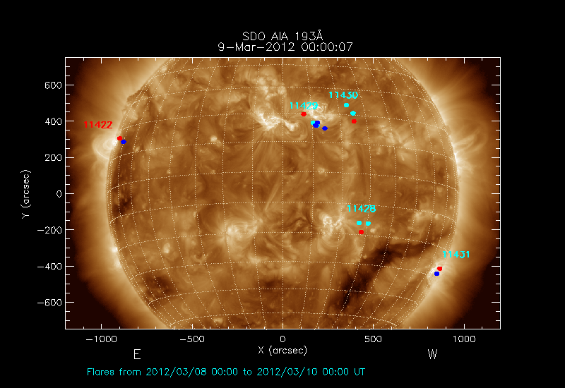 dots and 24-48 hours as turquoise dots; the flare locations are rotated to the time of the image.