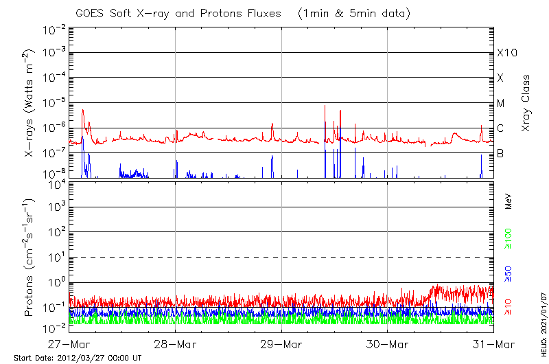 This page provides light-curves generated from GOES soft X-ray and Particle data for the date indicated at the top and the preceding three days.