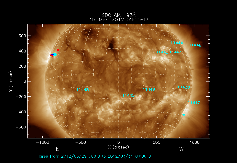 The most recent flares (≤12 hours) are shown as red dots, 12-24 hours ago as blue dots and older ones as turquoise dots.