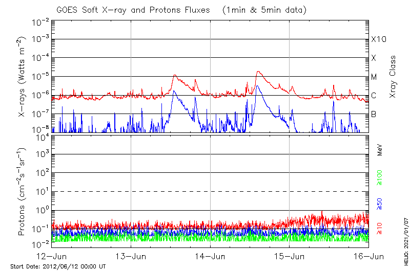 This page provides light-curves generated from GOES soft X-ray and Particle data for the date indicated at the top and the preceding three days.