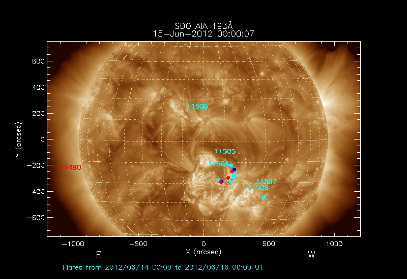 The locations of the flares over-plotted on the image are derived from the flare catalogue