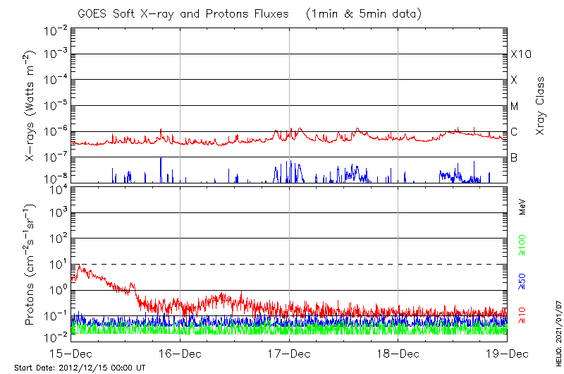 This page provides light-curves generated from GOES soft X-ray and Particle data for the date indicated at the top and the preceding three days.