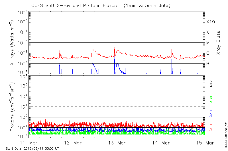 This page provides light-curves generated from GOES soft X-ray and Particle data for the date indicated at the top and the preceding three days.
