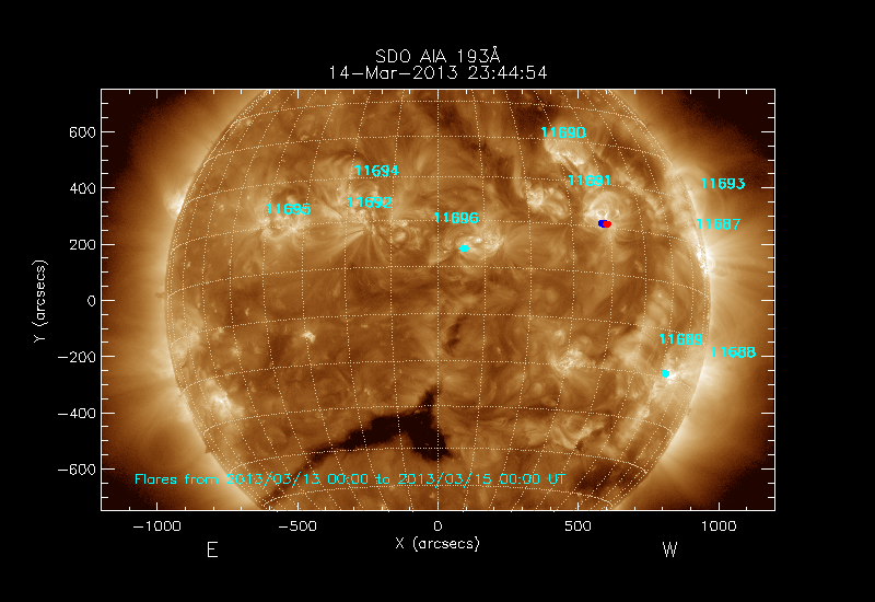 The locations of the flares over-plotted on the image are derived from the flare catalogue
