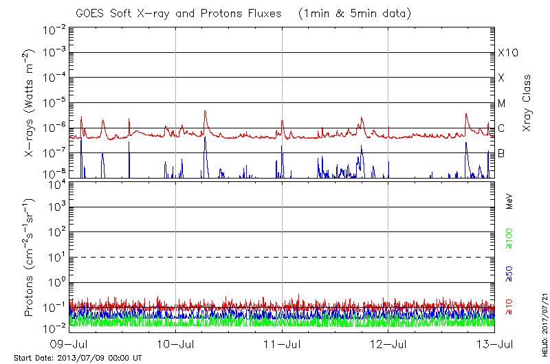 This page provides light-curves generated from GOES soft X-ray and Particle data for the date indicated at the top and the preceding three days. The designated date is the right most panel; the locations shown on the Flare Locations page are covered in the two right hand panels.