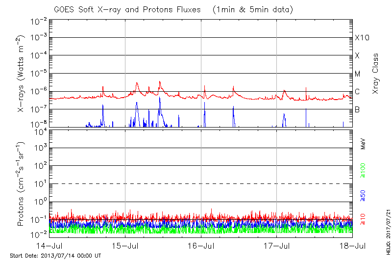 This page provides light-curves generated from GOES soft X-ray and Particle data for the date indicated at the top and the preceding three days.