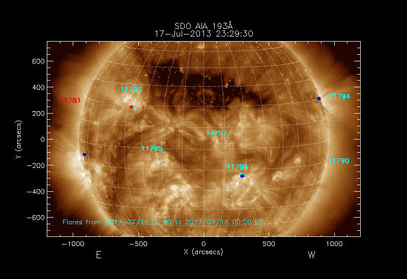 Click on an Active Region plot to display the Region Report including the region evolution and flaring history. HEC Search for NOAA Active Regions (SRS) records for this date and the day before.