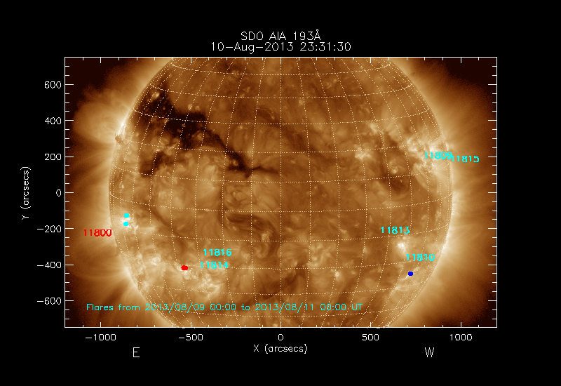 All soft X-ray flares (≥A1.0) where the location has been determined are shown; the flare locations are rotated to the time of the image