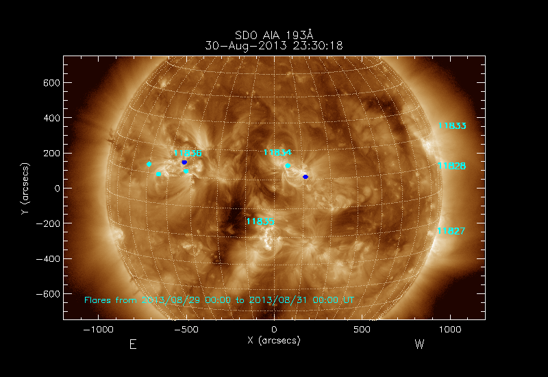 The locations of the flares over-plotted on the image are derived from the flare catalogue