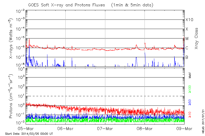 This page provides light-curves generated from GOES soft X-ray and Particle data for the date indicated at the top and the preceding three days.