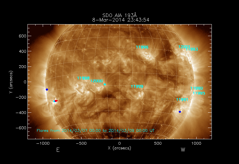Flares for the 48 hours leading up to the time are over-plotted; these are rotated to the time of the FITS image.