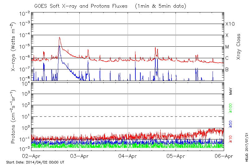 This page provides light-curves generated from GOES soft X-ray and Particle data for the date indicated at the top and the preceding three days.