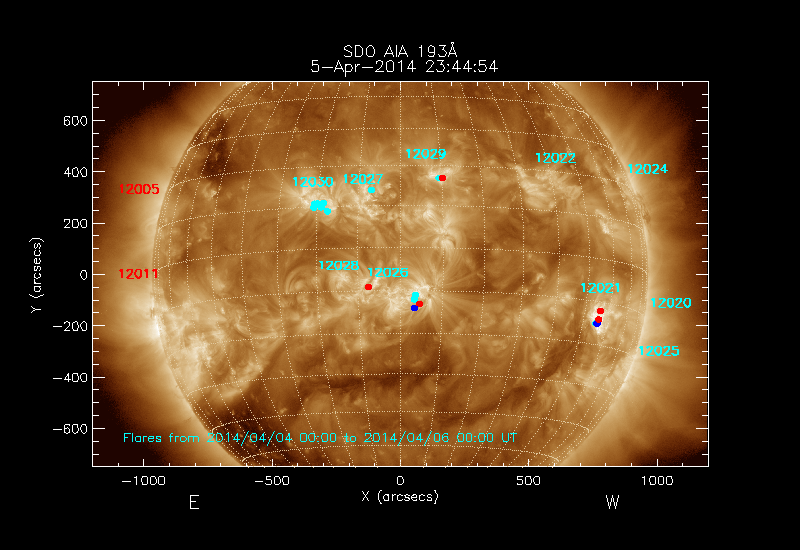 The most recent flares (≤12 hours) are shown as red dots, 12-24 hours ago as blue dots and older ones as turquoise dots.