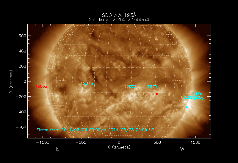 The locations of the flares over-plotted on the image are derived from the flare catalogue
