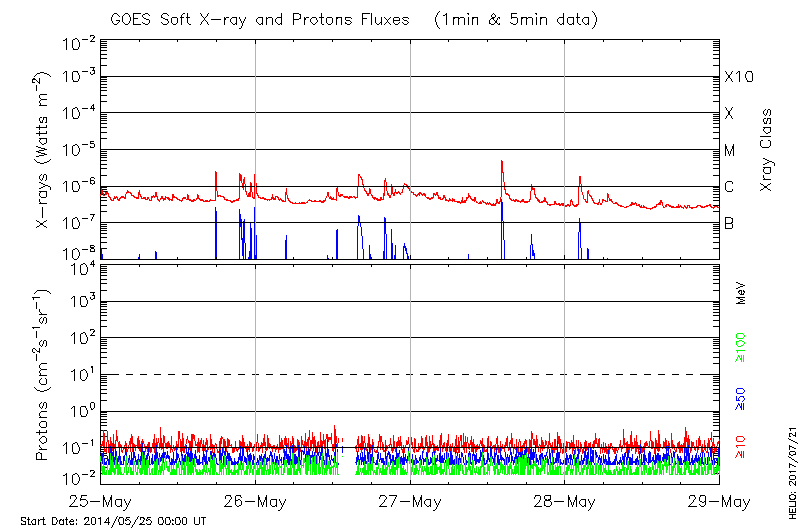 This page provides light-curves generated from GOES soft X-ray and Particle data for the date indicated at the top and the preceding three days.