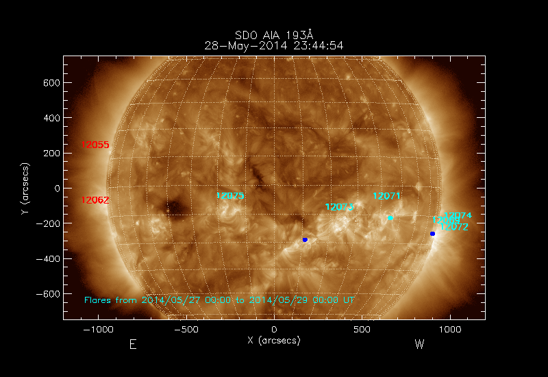 The locations of the flares over-plotted on the image are derived from the flare catalogue