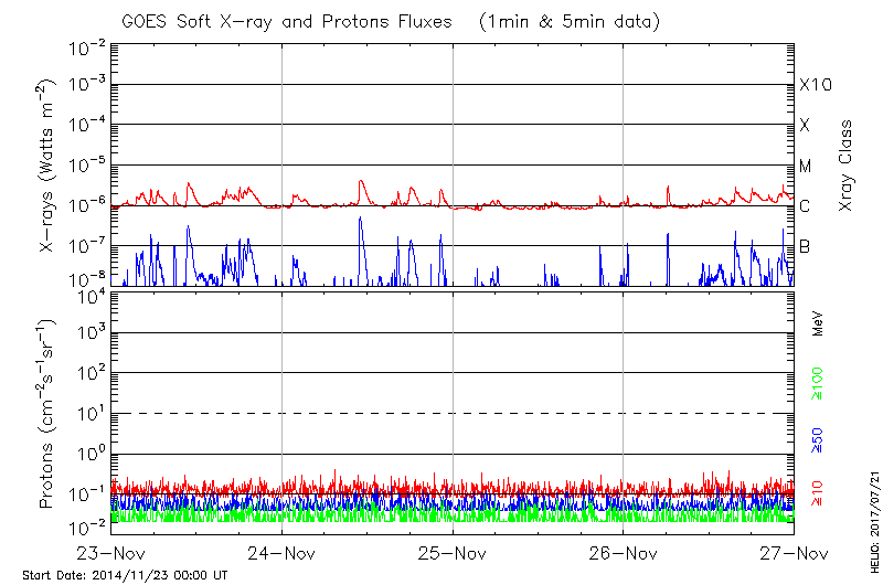 This page provides light-curves generated from GOES soft X-ray and Particle data for the date indicated at the top and the preceding three days.