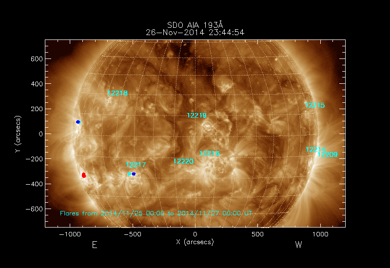 All soft X-ray flares (≥A1.0) where the location has been determined are shown; the flare locations are rotated to the time of the image