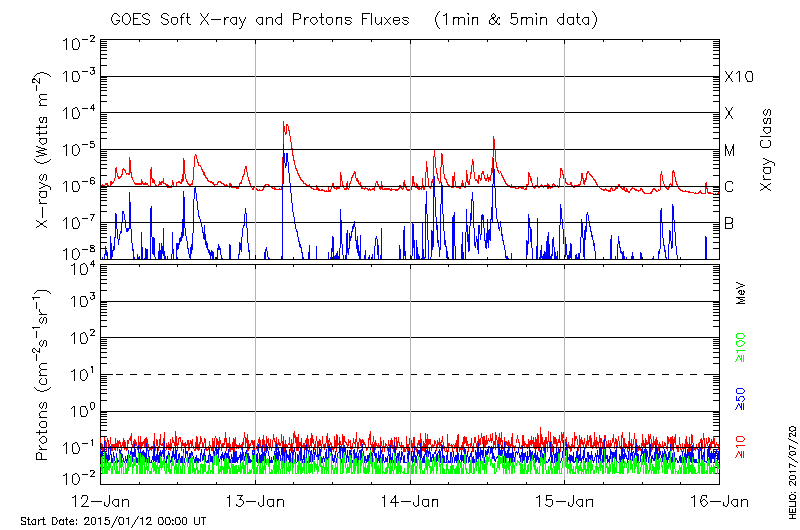 This page provides light-curves generated from GOES soft X-ray and Particle data for the date indicated at the top and the preceding three days.