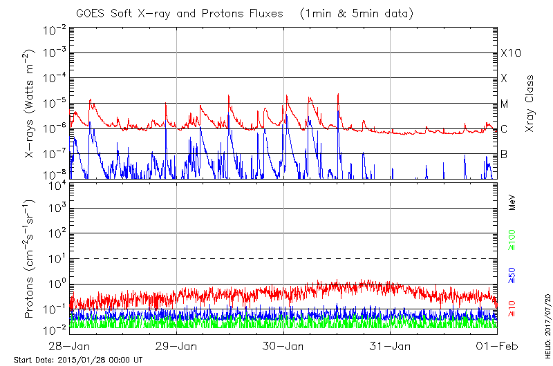 This page provides light-curves generated from GOES soft X-ray and Particle data for the date indicated at the top and the preceding three days.