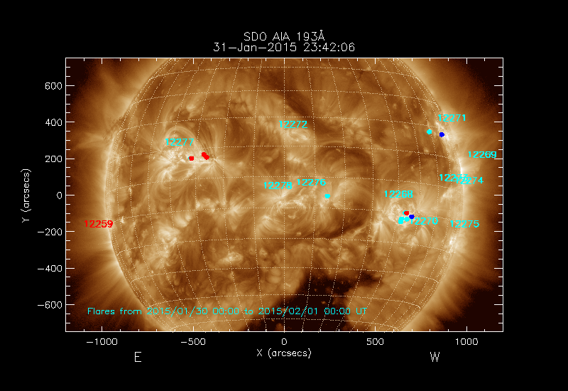 All soft X-ray flares (≥A1.0) where the location has been determined are shown; the flare locations are rotated to the time of the image