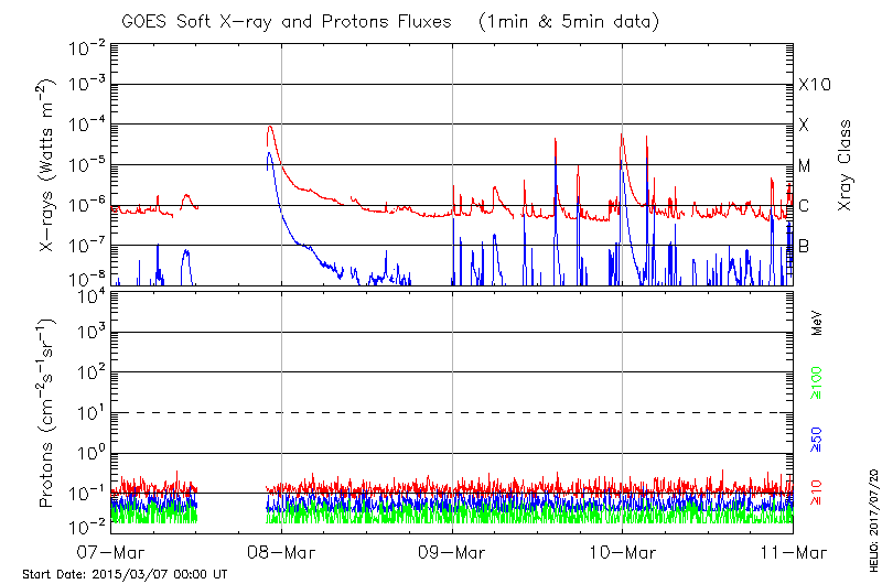 This page provides light-curves generated from GOES soft X-ray and Particle data for the date indicated at the top and the preceding three days.