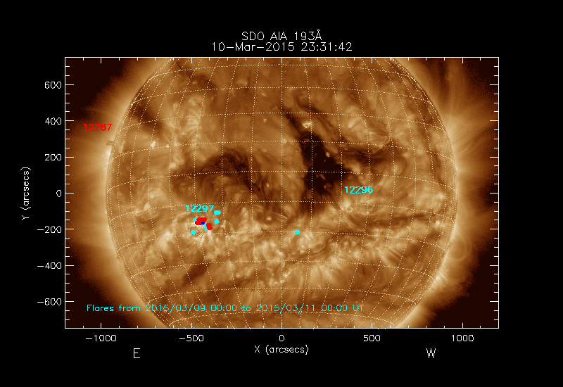 Flares for the 48 hours leading up to the time are over-plotted; these are rotated to the time of the FITS image.