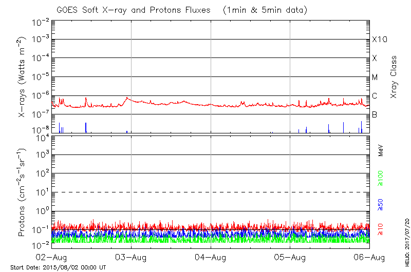 This page provides light-curves generated from GOES soft X-ray and Particle data for the date indicated at the top and the preceding three days.