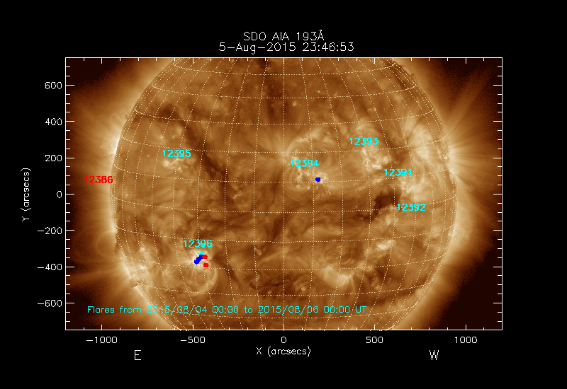 The most recent flares (≤12 hours) are shown as red dots, 12-24 hours ago as blue dots and older ones as turquoise dots.