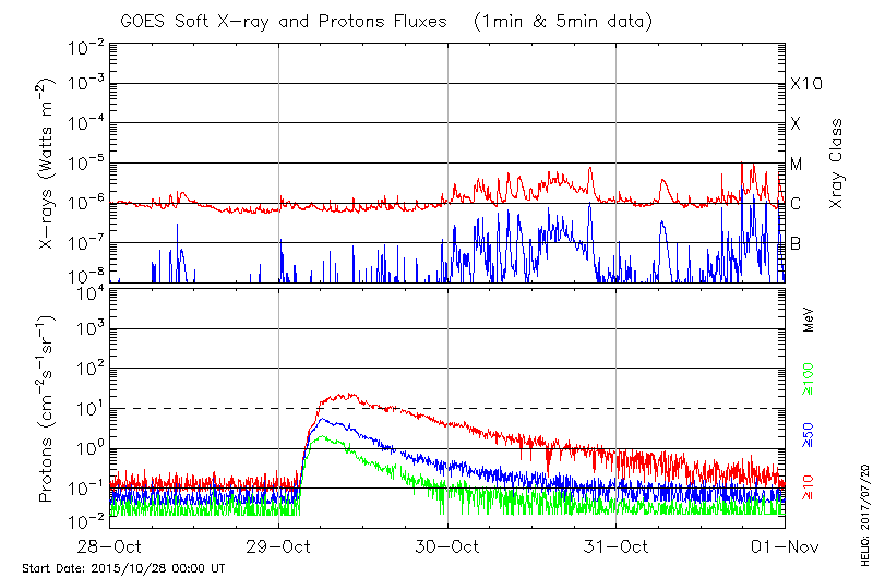 This page provides light-curves generated from GOES soft X-ray and Particle data for the date indicated at the top and the preceding three days.