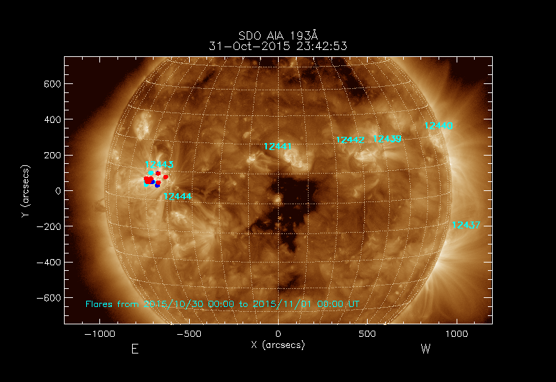 The locations of the flares over-plotted on the image are derived from the flare catalogue
